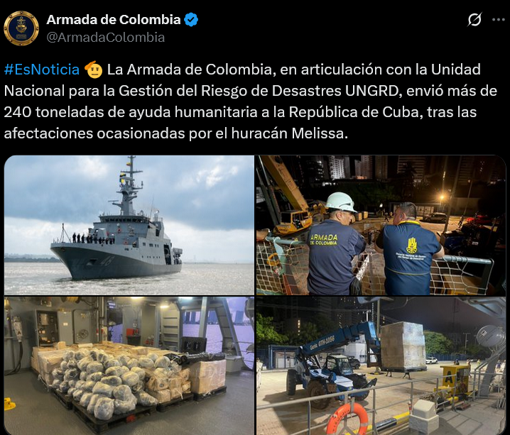 Se trata de un donativo del gobierno colombiano al pueblo cubano, para mitigar el sufrimiento por los daños causados por el huracán Melissa, en el oriente de la Isla caribeña, que si bien no dejó muertos o desaparecidos, si provocó severas afectaciones a las viviendas y la infraestructura de esa zona.