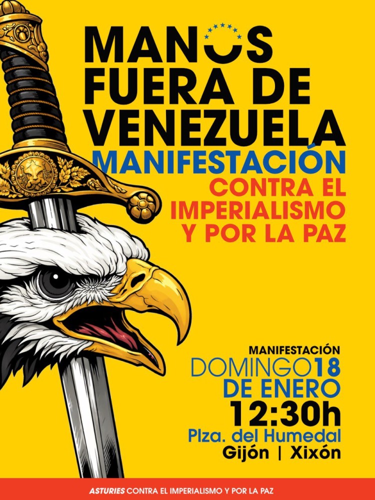 La convocatoria cita para el domingo 18 de enero, a las 12:30 horas, en la Plaza del Humedal de Gijón con la demanda de denunciar las agresiones e injerencias de Estados Unidos contra el país suramericano y exigir respeto a su soberanía, bajo el lema: “Manos fuera de Venezuela.