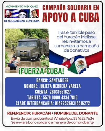El Movimiento Mexicano de Solidaridad con Cuba hizo un llamado solidario para apoyar con donativos económicos que permitan brindar ayuda al pueblo cubano.