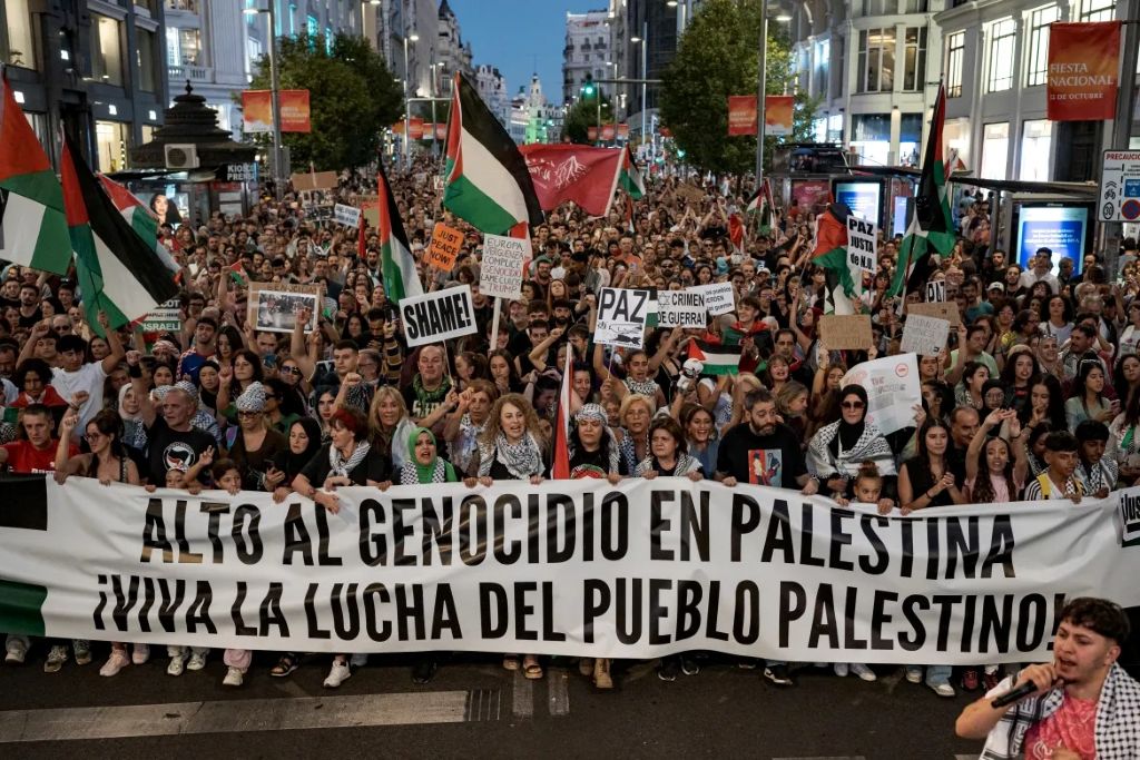 Individuals in Madrid paraded behind banners displaying the messages “Shame” and “Racist War, Free Palestine,” while vocally expressing the chant “Netanyahu (is a) Killer.”
