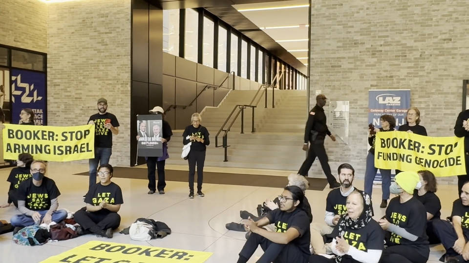 In the U.S. city of New Jersey, protesters led by Jewish Voice for Peace have occupied the lobby of a Newark high-rise that’s home to an office of Democratic Senator Cory Booker.
