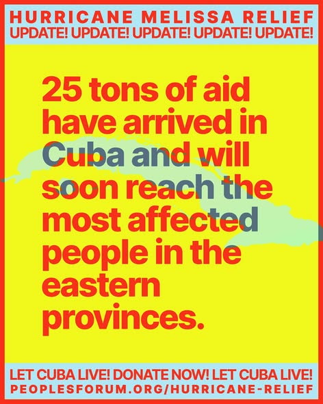 In the past 40 hours, over 530 people have donated over $44,970 for urgent relief supplies in the wake of Hurricane Melissa. Our first shipment with 25 tons of food and drinking water has arrived on the island and has been unpacked at Centro Martin Luther King in Havana. It will be soon brought to those most impacted in the eastern provinces. The swift delivery of this urgently-needed aid is thanks to the generosity of people around the world who have donated what they can to support the Cuban people in this challenging moment.