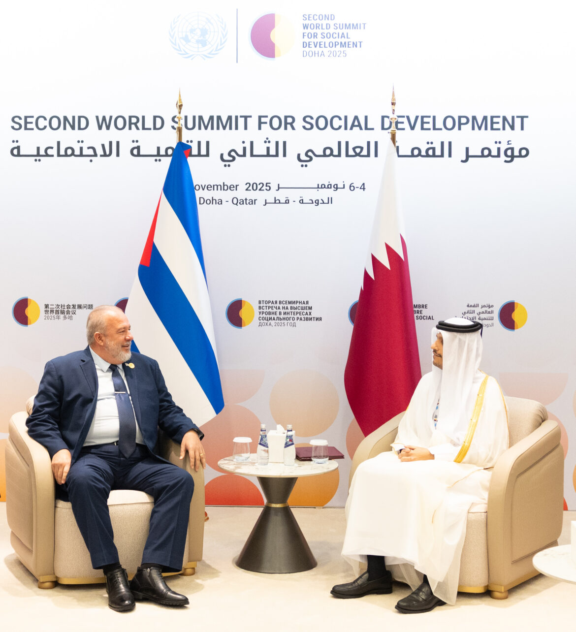 Prime Minister and Minister of Foreign Affairs Sheikh Mohammed bin Abdulrahman bin Jassim Al-Thani met Tuesday with Prime Minister of the Republic of Cuba Manuel Marrero Cruz, on the sidelines of the Second World Summit for Social Development 2025, currently held in Doha.