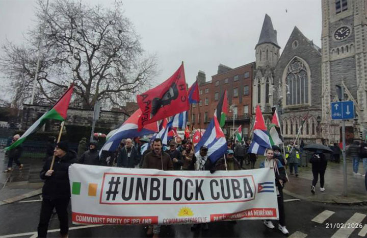 The article describes how, during the day, participants carried Palestinian, Cuban, and Irish flags as a symbol of solidarity with both peoples. The organizers emphasized that the coercive measures aim to strangle the Cuban economy and violate international law by preventing any country from sending fuel to the Caribbean nation.
