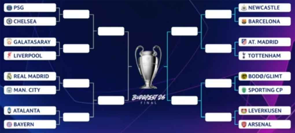 The Round of 16 is completed with the matches between Barcelona and Newcastle, Atlético Madrid and Tottenham, Bodø/Glint and Lisbon, Bayer Leverkusen and Arsenal, Galatasaray and Liverpool, and Atalanta and Bayer Leverkusen.