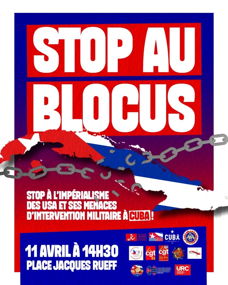 Various solidarity organizations are calling for a rally in Paris under the slogan “Stop the Blockade,” denouncing the United States’ policy toward Cuba. The event will take place on Saturday, April 11th at 2:30 p.m. in Place Jacques Rueff.