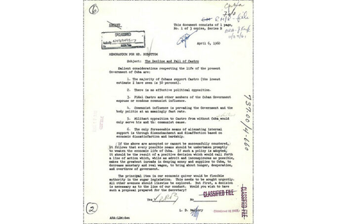 Le 6 avril 1960, Lester D. Mallory, alors sous-secrétaire adjoint du département d’État des États-Unis, rédigea un mémorandum interne proposant de refuser de l’argent et des fournitures à Cuba, de réduire ses salaires et de provoquer une famine extrême et le désespoir.