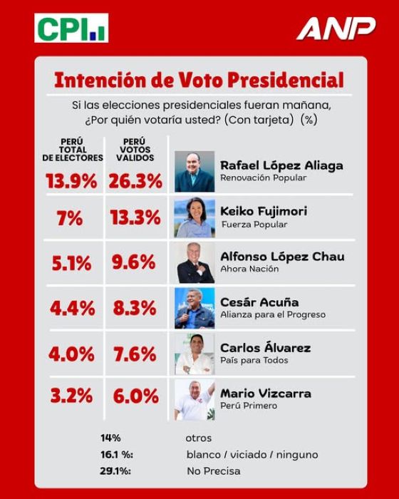 Datum place à la deuxième place le comique de droite Carlos Alvarez (8 %) et derrière lui le néolibéral Rafael López-Aliaga (7,6 %), en hausse le premier et en baisse le second.