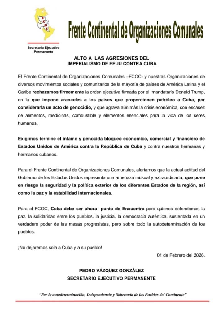 Al denunciar la agresión imperialista y reafirmando la solidaridad con nuestro pueblo; este pronunciamiento está firmado por Pedro Vázquez, presidente del Frente Continental de Organizaciones Comunales y diputado Federal en México, quien ratifica el compromiso de las organizaciones comunales de América Latina y el Caribe con la defensa de la soberanía cubana.