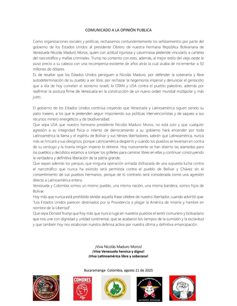 La cuenta de facebook de la organización añade un mensaje: «Las organizaciones y movimientos sociales aqui firmantes, desde la ciudad de Bucaramanga-Colombia denunciamos y rechazamos las pretensiones de Donald Trump de ponerle precio a la cabeza de Nicolás Maduro Moros, legítimo presidente de la república bolivariana de Venezuela, además, en rechazo a la reciente instalación de buques militares en el Caribe para rodear a Venezuela en su intención de invadir militarmente a nuestro hermano pueblo hijo de Bolívar y Chávez».