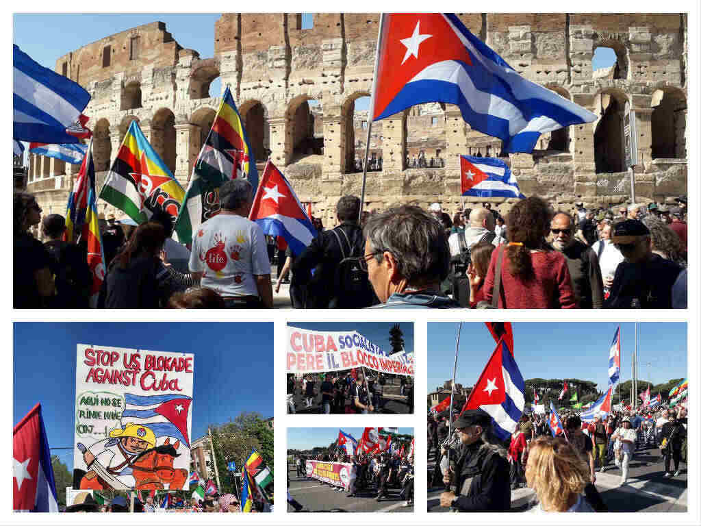 En la marcha, organizada por la Asociación Nacional de Amistad Italia-Cuba (Anaic), participaron más de diez mil personas convocadas por numerosas organizaciones políticas, sociales y sindicales, quienes partieron a las 15:00 hora local desde el emblemático Coliseo Romano.