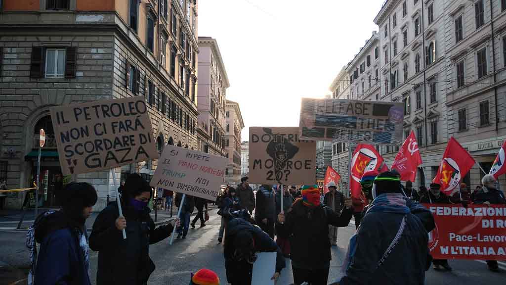 Em Roma, ocorreu uma manifestação de repúdio aos recentes ataques imperialistas do governo dos EUA. A marcha percorreu diversas avenidas do centro da cidade, da Praça do Esquilino até a embaixada dos EUA.
